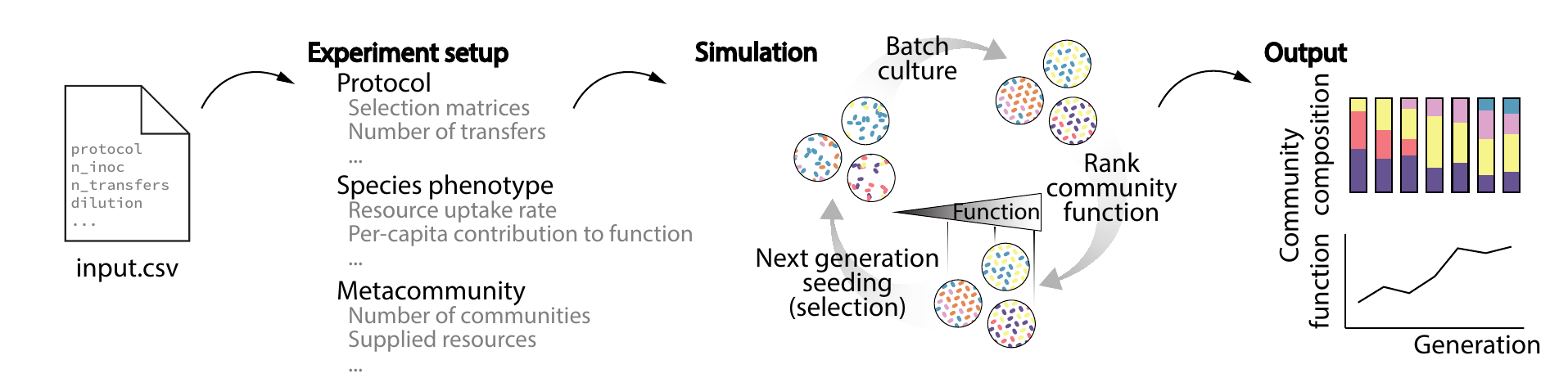 We treat microbial consortia as evolving entities, subject to artificial selection on desired community traits. By combining experimental evolution and modeling, we develop frameworks for optimizing microbiome function and stability.